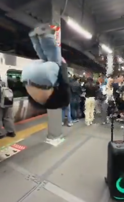 - 駅ホームでの危険なバク宙: 電車を降りた後、駅のホーム上でも迷惑行為は続きました。他の乗客や通行人がすぐ近くにいるにも関わらず、彼はその場で突然バク宙を披露したのです。狭いホーム上で、しかも予期せぬタイミングでのアクロバットは、周囲の人々を危険に晒す可能性のある極めて無謀な行為です。